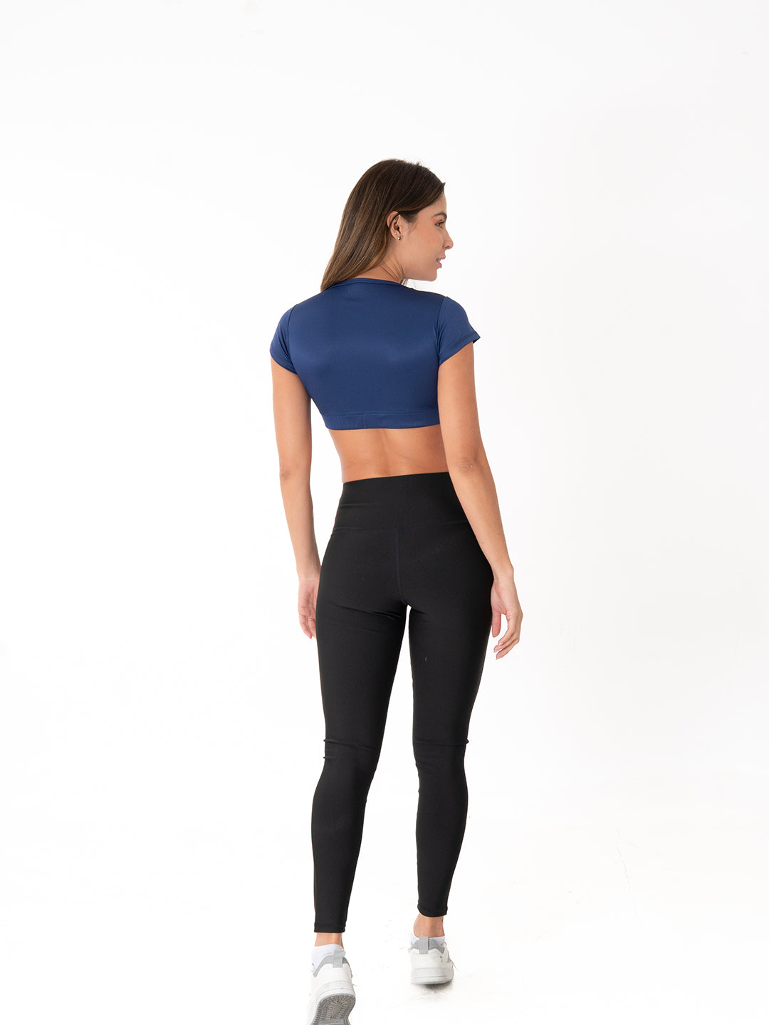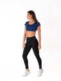 Su diseño tipo crop con manga corta ofrece mayor cobertura en la parte superior mientras mantiene frescura y libertad de movimiento. Ideal para quienes buscan comodidad sin sacrificar estilo.